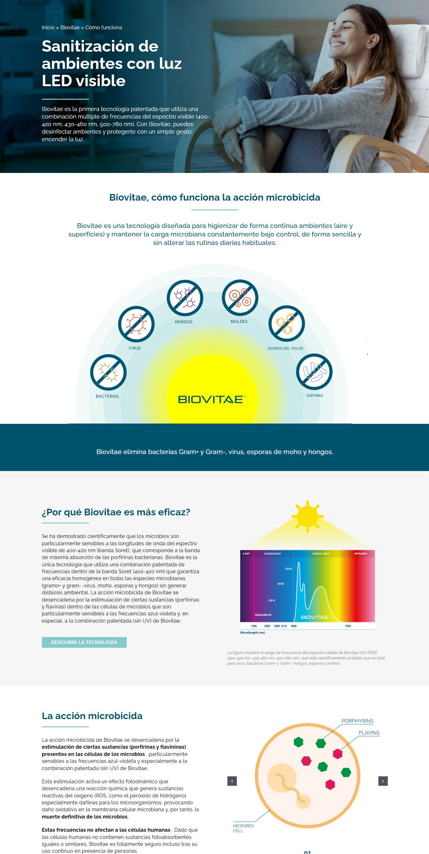 La acción microbicida se activa gracias a la acción de una combinación de algunas frecuencias del espectro visible (LIBRE DE RAYOS UV) en el rango de 400 y 420 nm, que según innumerables estudios de institutos y universidades científicas, han demostrado ser dañinas para las bacterias y otros microorganismos (hongos, esporas, mohos). Esta combinación de frecuencias de BIOVITAE ha sido testada también contra el CORONAVIRUS.
