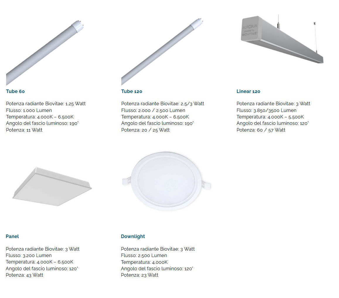 Por el momento BIOVITAE Domus se comercializa solo con luz fría (5000 ° K-Cool White), pero pronto estarán disponibles en el mercado dos modelos con luz neutra (4000 ° K-Blanco luz de luna) y con luz cálida (3000 ° K-Cálida Blanca).