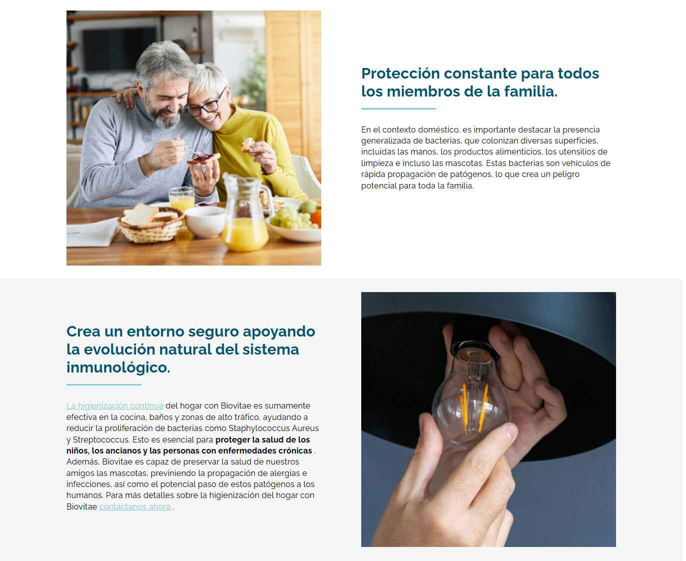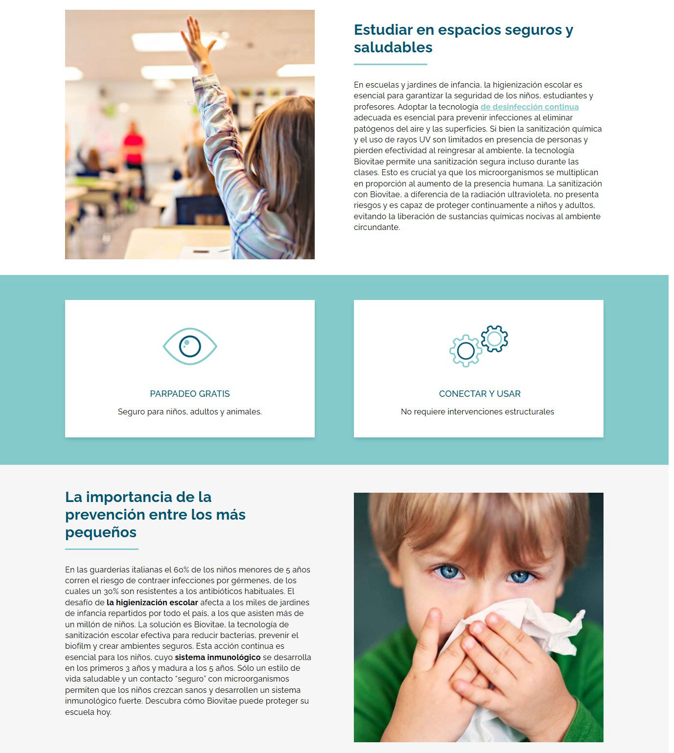 Porque, a diferencia de todas las demás soluciones de higienización, con BIOVITAE se está siempre protegido. De hecho, BIOVITAE garantiza una higienización continua, incluso en presencia de seres vivos, a diferencia de otros sistemas de desinfección - desde detergentes químicos, pasando por ozono hasta rayos UV - que solo pueden utilizarse en ausencia de personas. La higienización continua es la solución más eficaz para la prevención y contención de infecciones bacterianas o virales y representa una respuesta importante a la resistencia antibiótica bacteriana. La luz actúa con total seguridad, en presencia del hombre y en cualquier entorno, BIOVITAE salvaguarda la resilencia natural de nuestro sistema inmunológico proporcionando una respuesta eficaz para la protección de niños, adultos y animales.