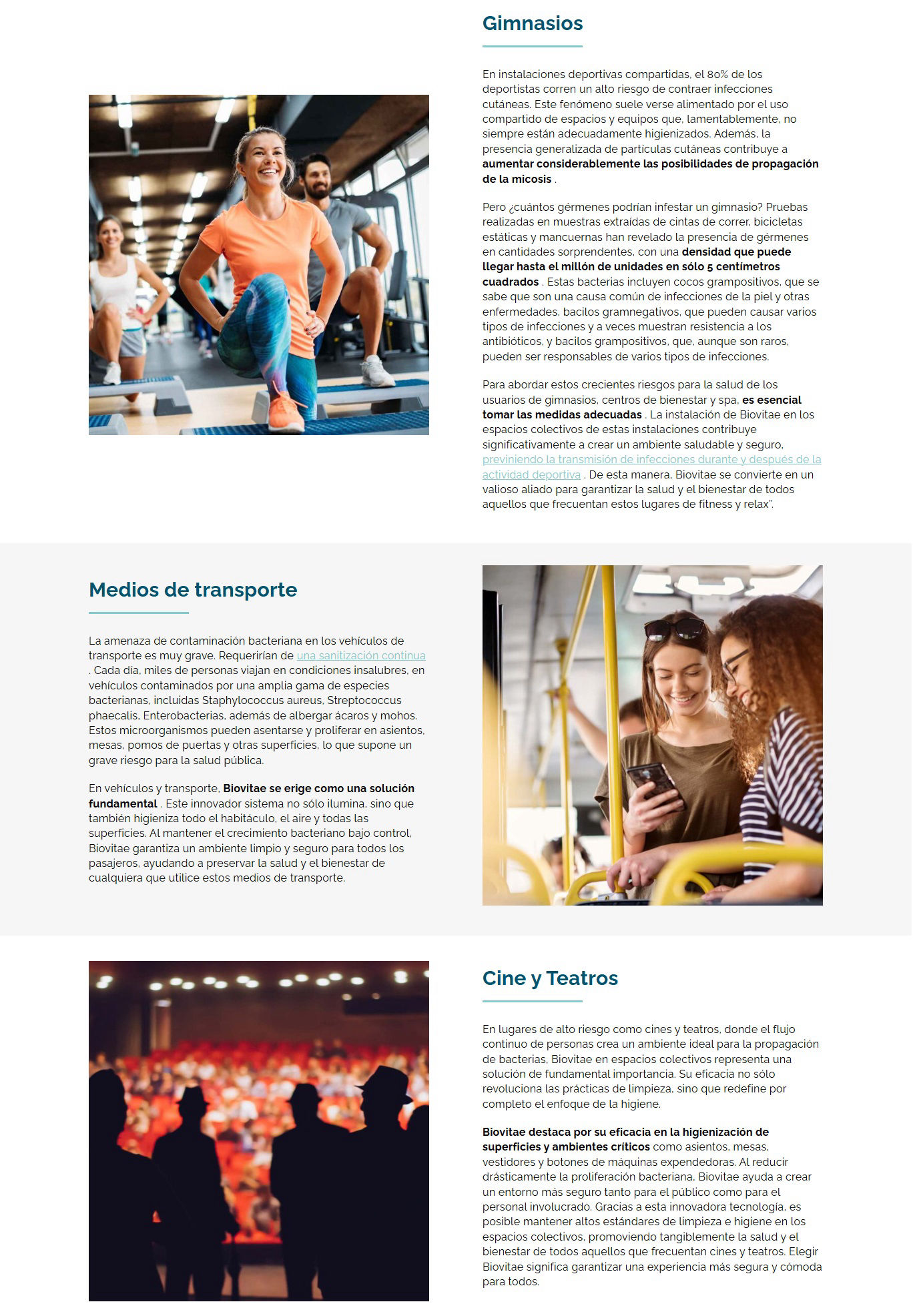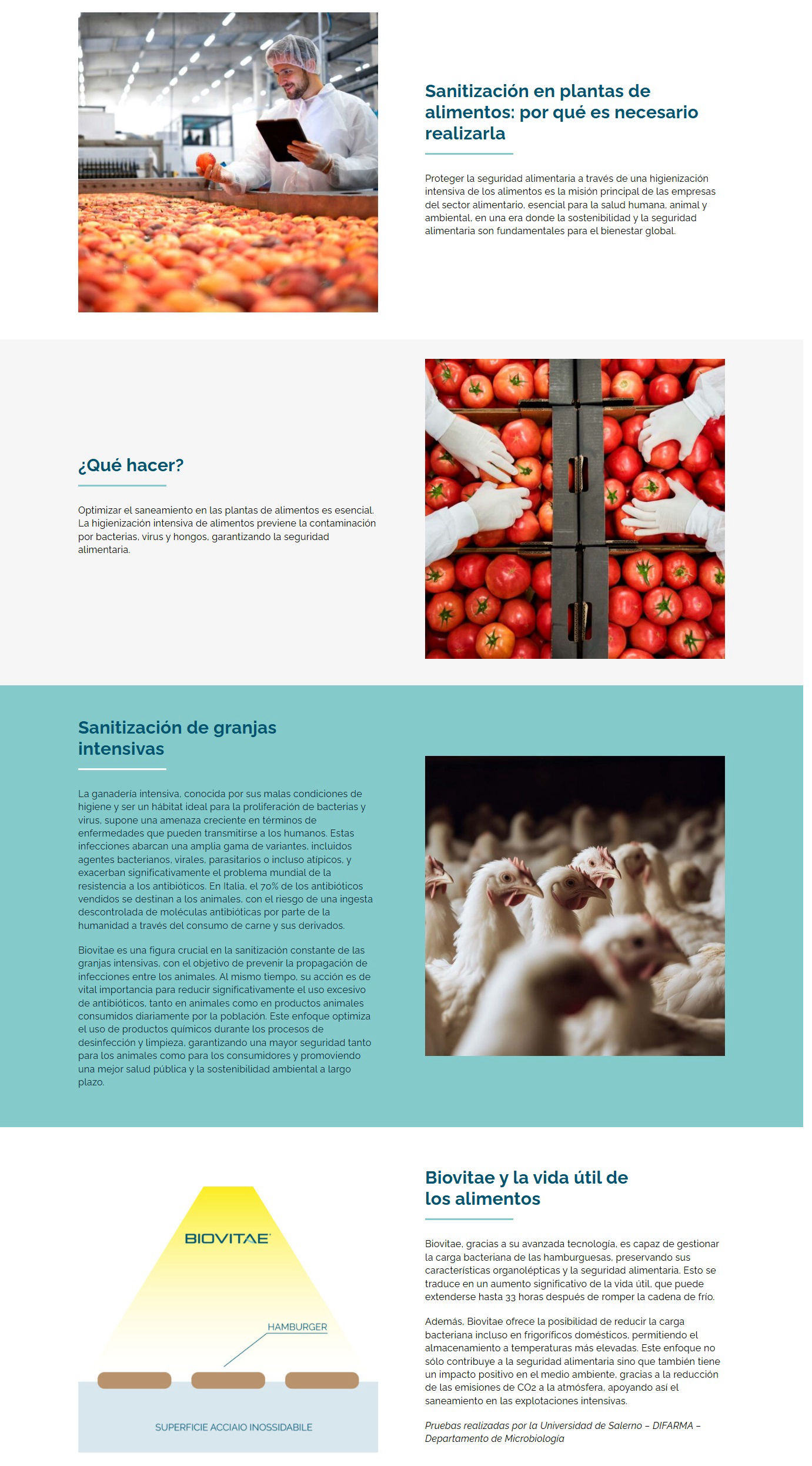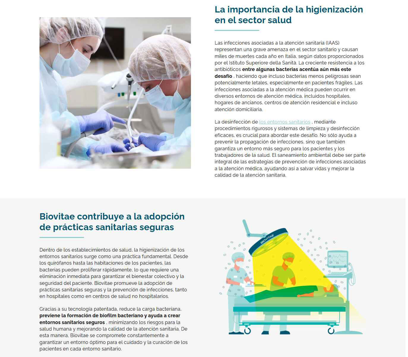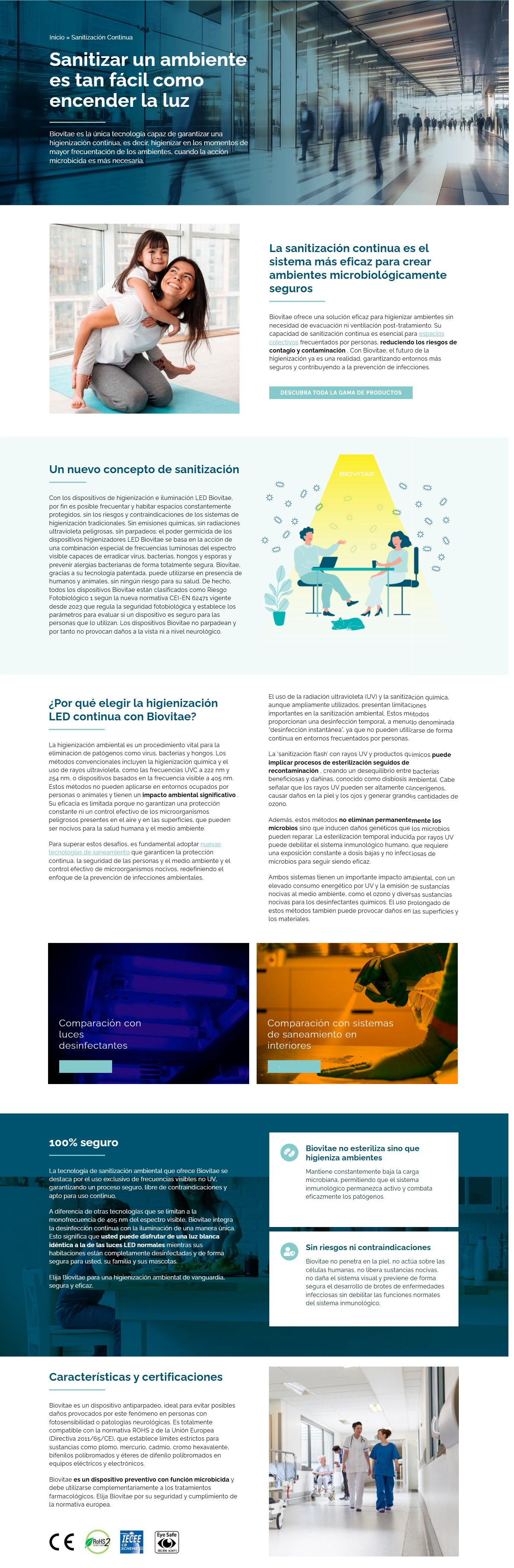 Hasta hace poco, la irradiación de luz antimicrobiana más conocida y más extendida ha sido aquella con longitudes de onda de luz del espectro ultravioleta (UV), particularmente de la radiación UV-C (240 y 260 nm), que se utiliza tradicionalmente para la desinfección. Ahora se ha demostrado que la radiación ultravioleta no solo es eficaz en presencia de parámetros ambientales particulares (temperatura, humedad, etc.), sino que puede ser cancerígena para los seres humanos y también puede modificar las características organolépticas y nutricionales de los alimentos, así como las características de los materiales (por ejemplo, debilitando los plásticos). Además, los rayos UV actúan sobre la estructura genética del microorganismo, no eliminándolo definitivamente sino provocando su inactivación, es decir, inhibiendo su función replicativa pero dejándolo metabólicamente activo. Descubrimientos recientes han demostrado que algunos microorganismos, en particular las bacterias, tienen mecanismos capaces de reparar el daño genético inducido por los rayos UV-C así como algunos virus que pueden reactivarse utilizando algunas enzimas de los huéspedes en los que se han asentado. BIOVITAE no es nocivo para los seres vivos, se puede utilizar en espacios interiores en cualquier condición ambiental eliminando irreversiblemente los microorganismos sobre los que actúa.