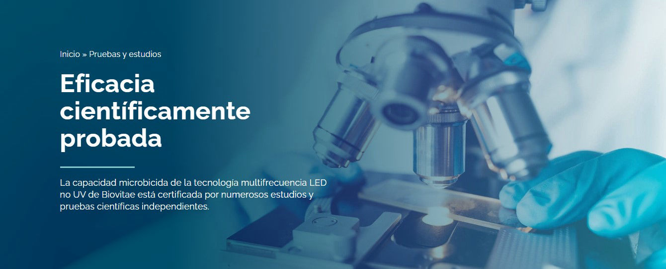 La capacidad microbicida de la tecnología multifrecuencia LED no UV de Biovitae está certificada por numerosas pruebas y estudios científicos independientes