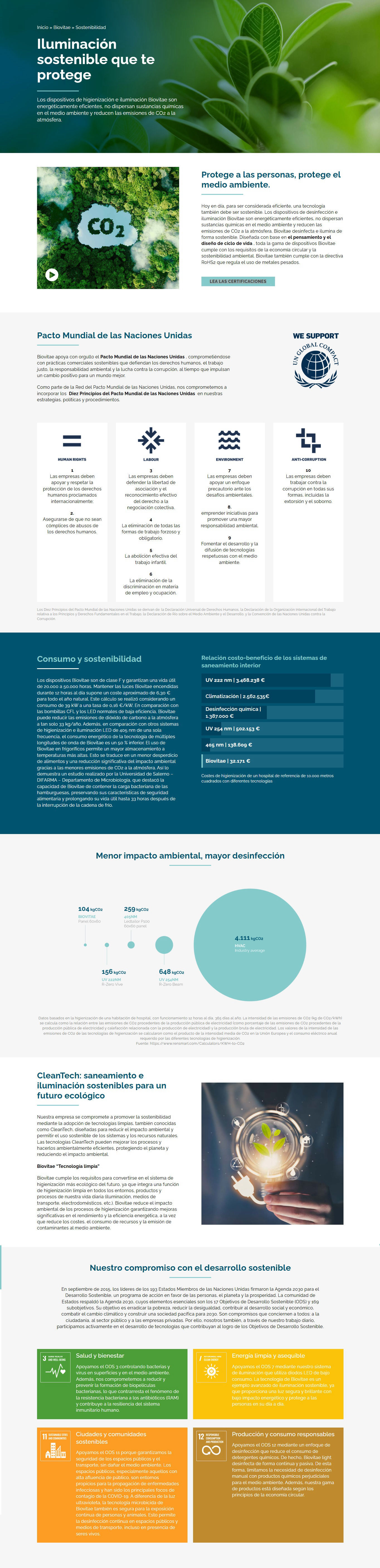 Hoy en día, para ser considerada eficiente, una tecnología también debe ser sostenible. Los dispositivos de desinfección e iluminación Biovitae son energéticamente eficientes, no dispersan sustancias químicas en el medio ambiente y reducen las emisiones de CO2 a la atmósfera.
